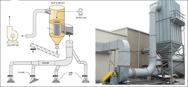 Trên thực tế thì dòng khí và bụi phát sinh trong quá trình sản xuất gỗ từ khu vực sản xuất sẽ được dẫn vào chụp hút qua hệ thống ống thu bụi và khí đưa về Cyclon.